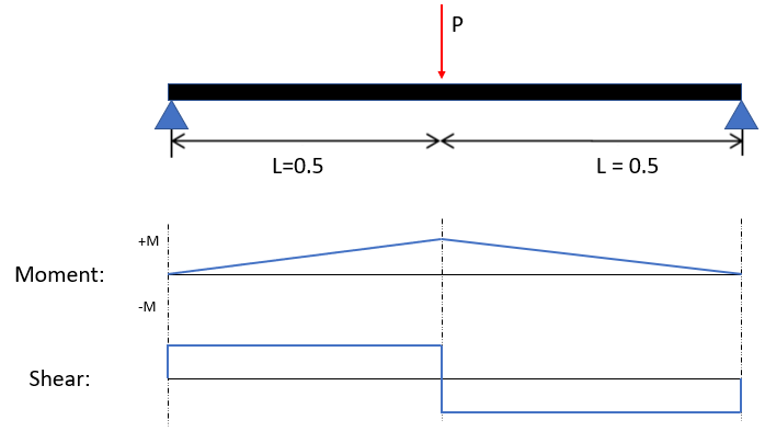 The simply supported beam with only one force at the mid-span acting downwards will have reactions at the supports acting upwards. Therefore, the shear diagram will rise at the supports, be constant across until mid-span where the force is located. The shear diagram will drop vertically at mid span and then be constant again until the support at the end. Remember, shear is zero at the maximum moment in this example, which is at the middle point. The moment diagram is a diagonal line, since the shear diagram was vertical and horizontal lines.
